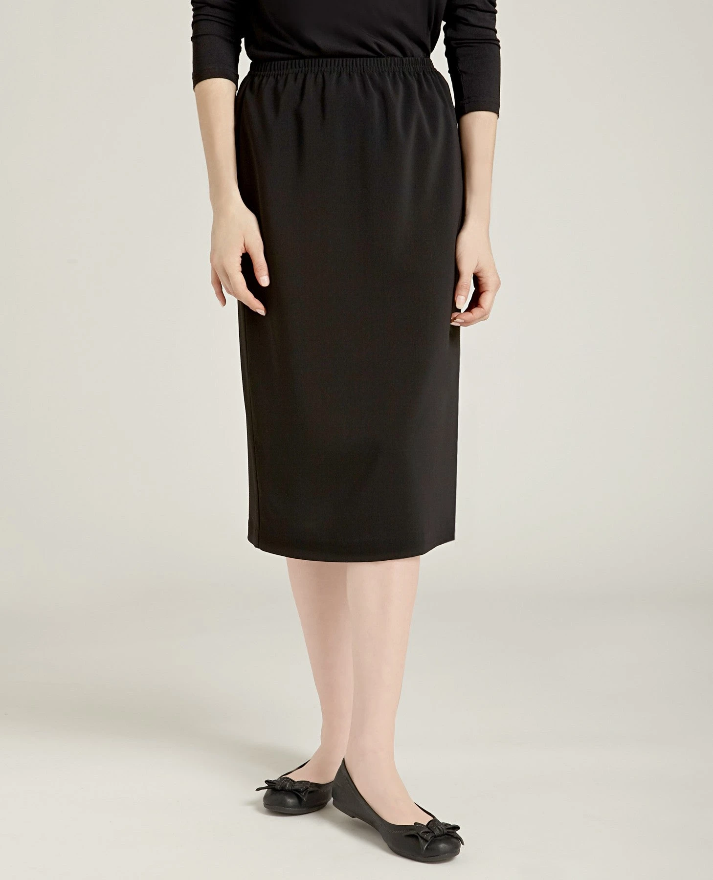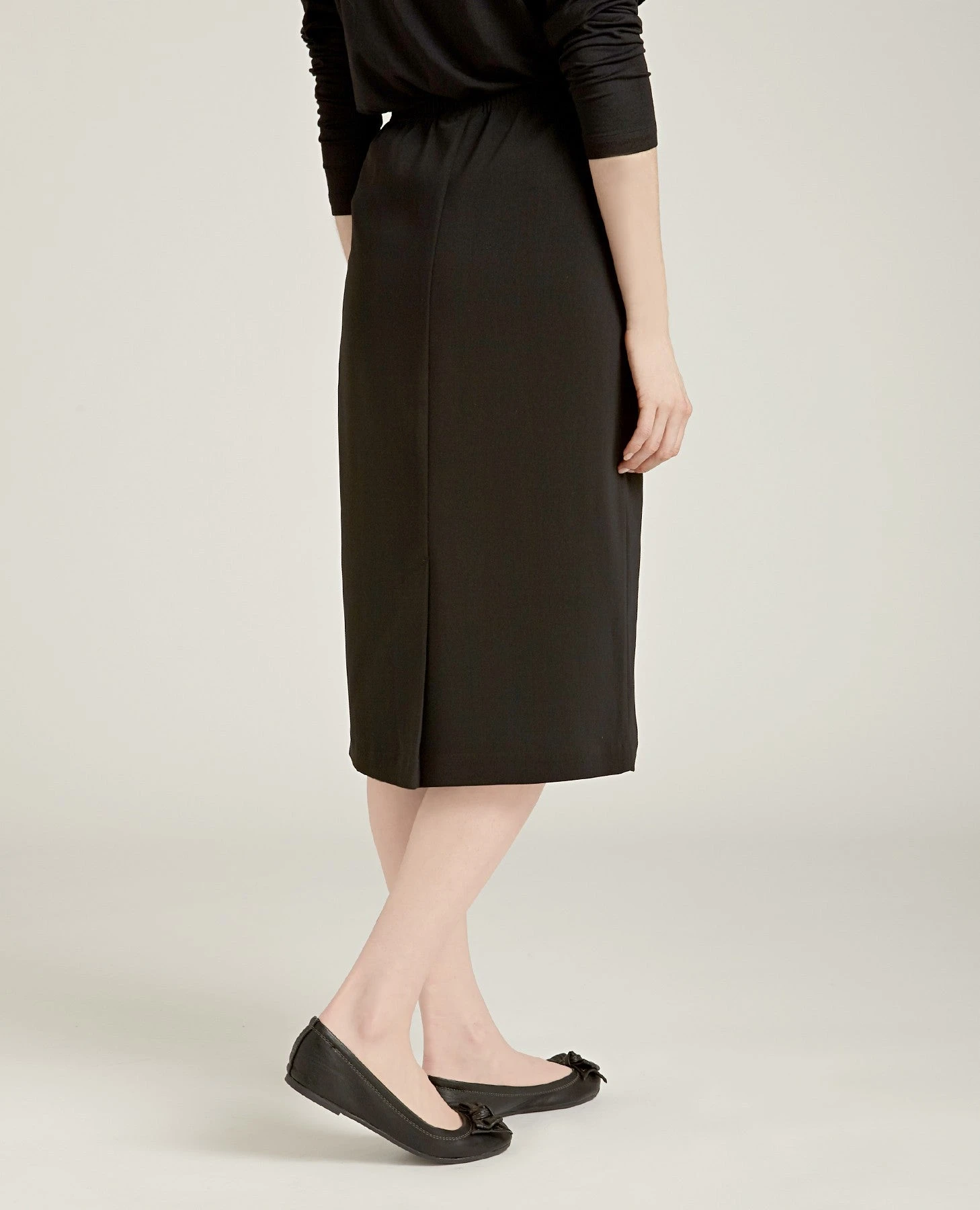 Crepe skirt is 27″ from the waist. It has a polished dry clean look and feel, but is (incredibly!) machine washable. We’ve included a lining – no need for a slip! The perfect skirt for both home and office.