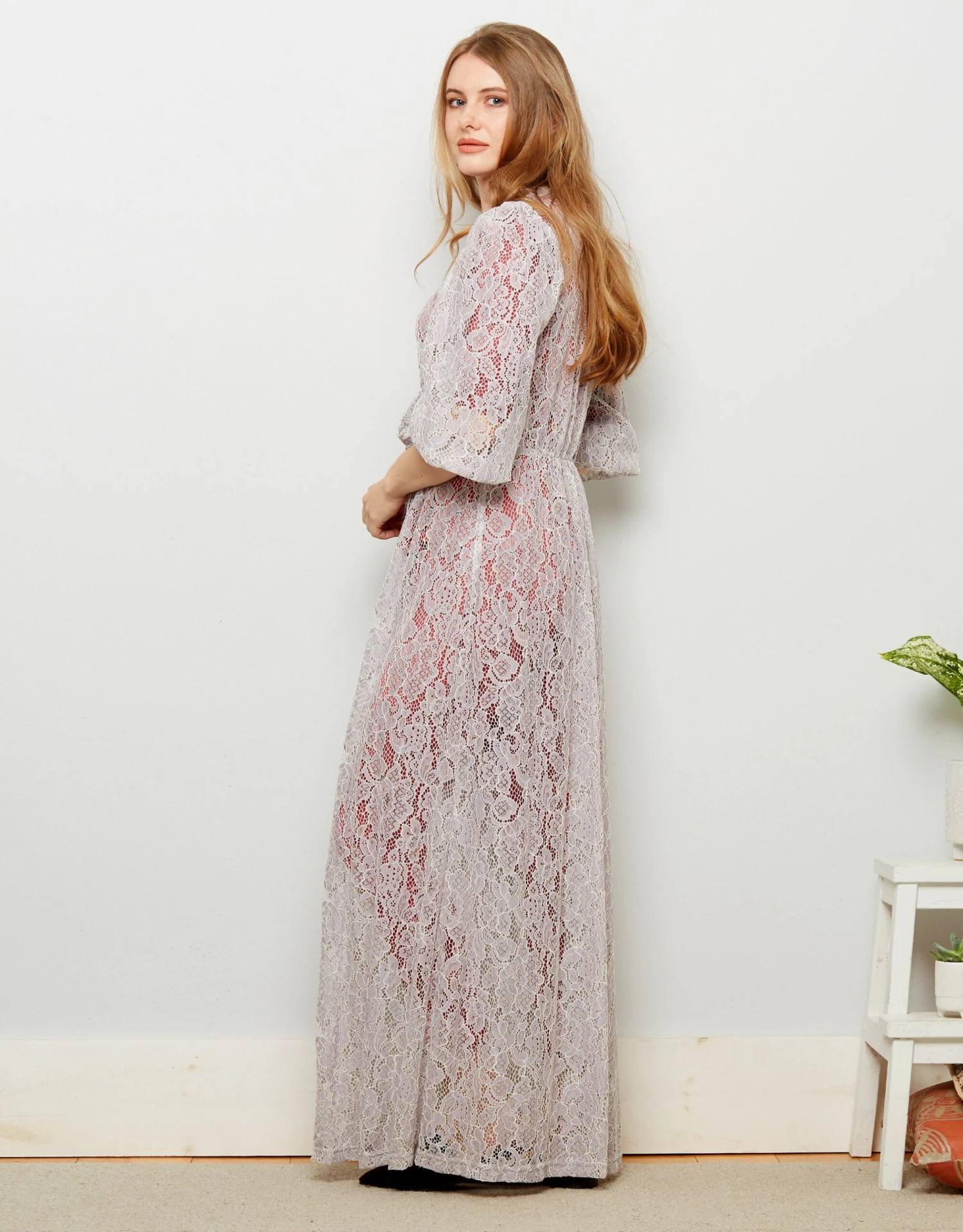 Elegant floor length lace wrapper has pretty puff sleeves and ties into a bow at the waist. A sweet?β‘ romantic addition to any bridal collection and a beautiful gift idea for someone special.